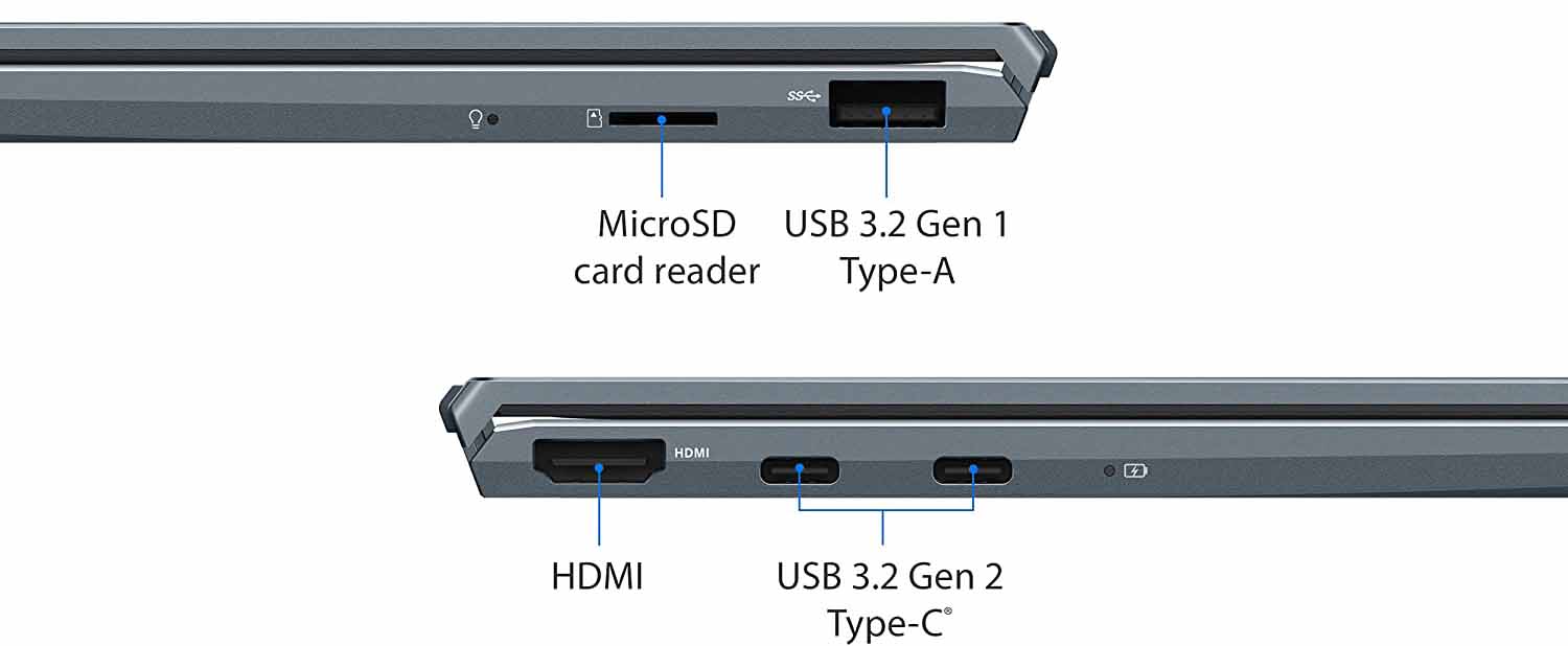 ZenBook 13 OLED آنچه را که در یک لپتاپ فوق نازک ممکن است دوباره تعریف میکند. این مجموعه کاملی از پورت های ورودی/خروجی 5، از جمله HDMI با اندازه کامل، USB Type-A و USB-C® را در اختیار شما قرار می دهد. همچنین یک کارت خوان microSD برای انتقال آسان داده ها از دستگاه تلفن همراه شما وجود دارد.