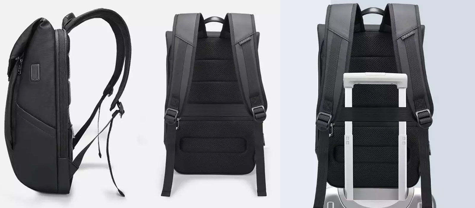 کوله پشتی دانشجویی با بندهای پهن و قابل تنظیم به شما این امکان را می دهد تا بسته به سلیقه و نیازتان، تنظیمات لازم را انجام دهید. طراحی بندها به گونه ای است که علاوه بر ساختار نرمی که دارد وزن بار را به صورت متعادل در ناحیه گردن و سیستم اسکلتی عضلانی توزیع می کند. از طرفی این کوله پشتی ضد آب یک دسته کوچک و نرم در قسمت بالا برای گرفتن راحت تر دارا می باشد. پشت کوله پشتی و بند های شانه ای پهن با اسفنج های الاستیک پوشانده شده تا کوله پشتی برای استفاده نرم و راحت باشد. به علاوه از تعریق جلوگیری می نماید. در قسمت پشتی نیز یک کمربند نایلونی تعبیه شده است که به لطف آن می توانید کوله پشتی را روی دسته کیف پرواز قرار دهید. همچنین یک جیب امن در این قسمت تعبیه شده که می توانید برای مثال گوشی یا کیف پول خود را در آن قرار دهید.