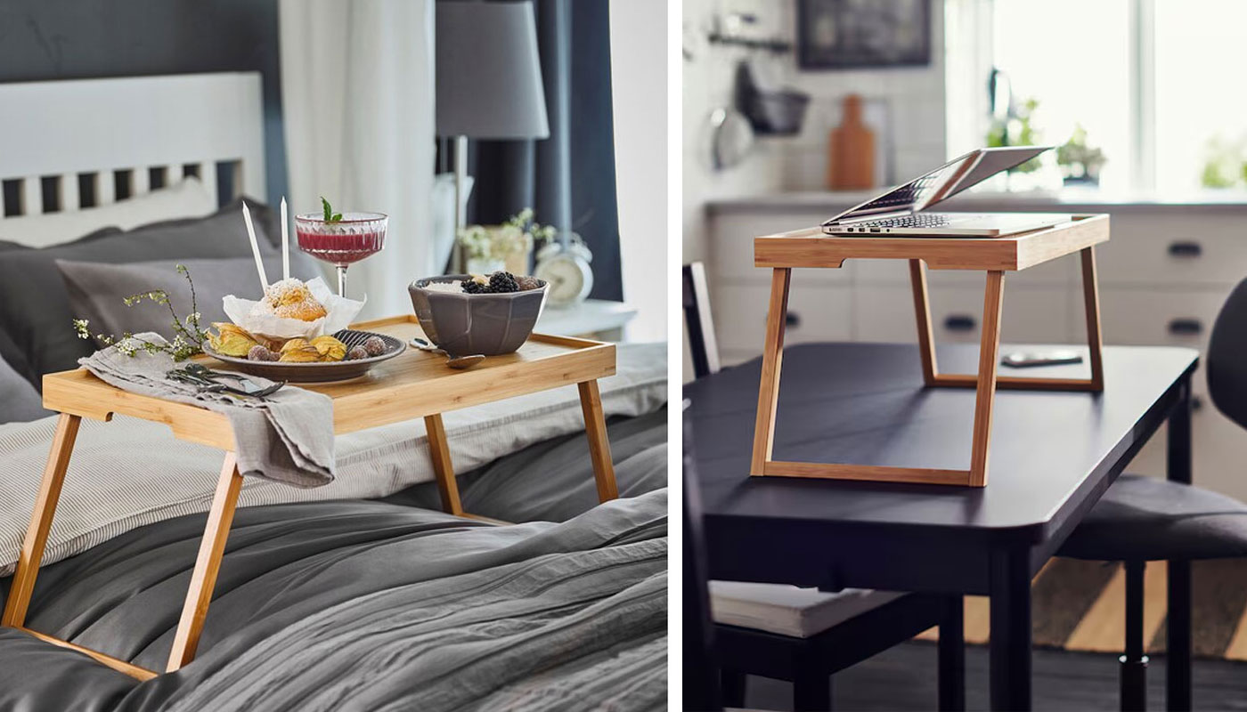 این سینی به راحتی شما در تخت خواب کمک بسیاری می کند زیرا می توانید پاهای خود را از زیر این سینی رد کنید و به راحتی لم دهید و صبحانه خود یا هر وعده غذایی دیگر را میل کنید. از دیگر ویژگی های این محصول می توان به پایه های متحرک و جدا شونده ی آن اشاره کرد به این صورت که هر زمان که نیاز به پایه ها ندارید می توانید به راحتی پایه ها را جدا کنید. این محصول از جنس چوب بامبو می باشد یکی از مزیت های جنس بامبو قابل بازیافت بودن آن است که ایکیا معمولا در تمامی محصولات خود از جنس های قابل بازیافت استفاده می کند که این مورد گزینه ای مفید برای طبیعت می باشد. این محصول با طول 52 سانتی متر، عرض 29 سانتی متر و ارتفاع 25.5 سانتی متر تولید می شود، برای تمیز کردن این سینی از یک دستمال استفاده کنید.