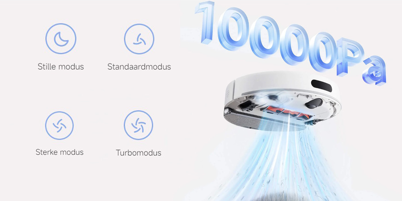 با مکش قدرتمند 10000 پاسکال گرد و غبار، خردههای کاغذ، خردههای غذا و غلات را راحتتر پاک کنید. از بین چهار حالت جارو رباتیک (حالت بی صدا، حالت استاندارد، حالت قوی، حالت توربو) متناسب با نیاز خود یک حالت را انتخاب کنید.