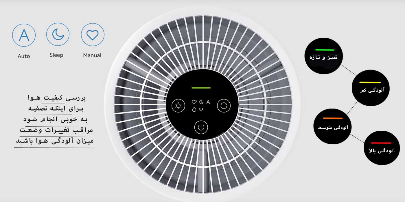 - حالت خودکار (Auto): در این حالت، دستگاه به صورت هوشمند و با توجه به میزان آلودگی هوا، سرعت فن را تنظیم میکند تا همواره کیفیت هوای مطلوب را فراهم کند.